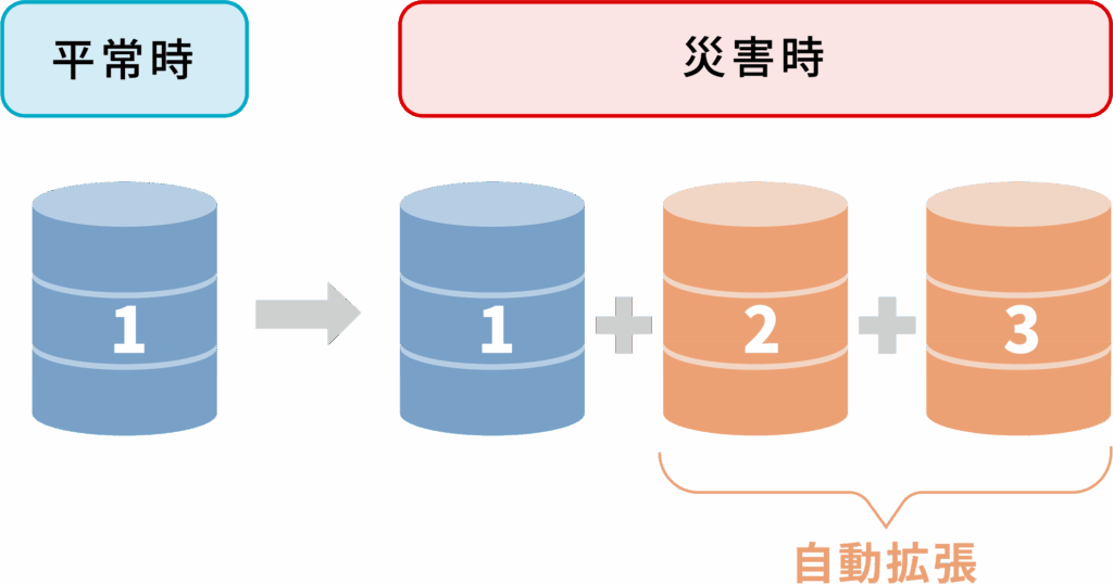 大規模災害時、多くの利用者様から大量アクセスがあってもシステムが稼働続けられるようDBサーバを自動拡張する仕組み「オートスケールシステム」を導入しております。