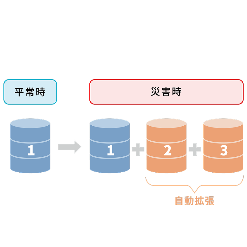 大規模災害時、多くの利用者様から大量アクセスがあってもシステムが稼働続けられるようDBサーバを自動拡張する仕組み「オートスケールシステム」を導入しております。