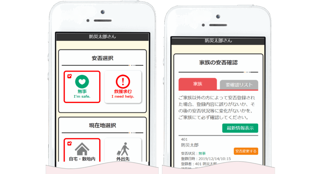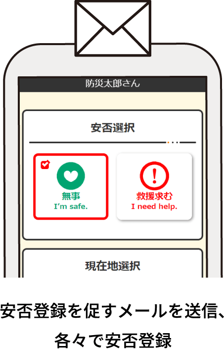 - 安否確認安否登録を促すメールを送信、各々で安否登録