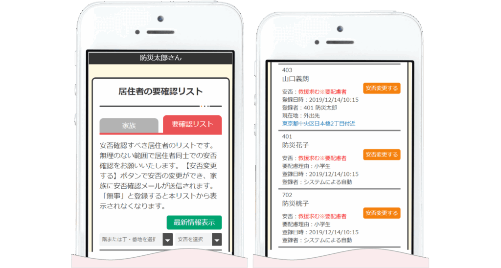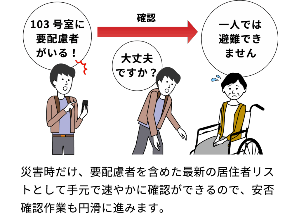 ※1「「救援求む」と安否登録した人、事前に要配慮者登録をした人、安否未登録者などの要確認者の部屋番号と名前をリストで共有