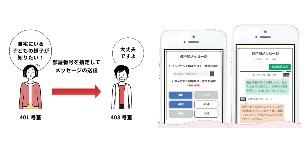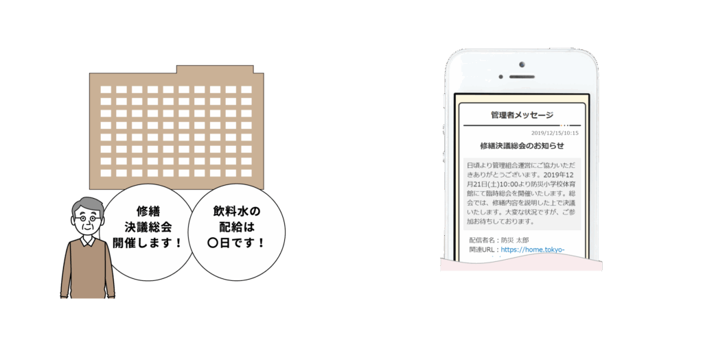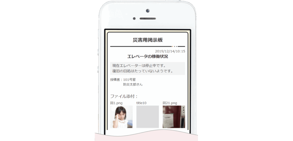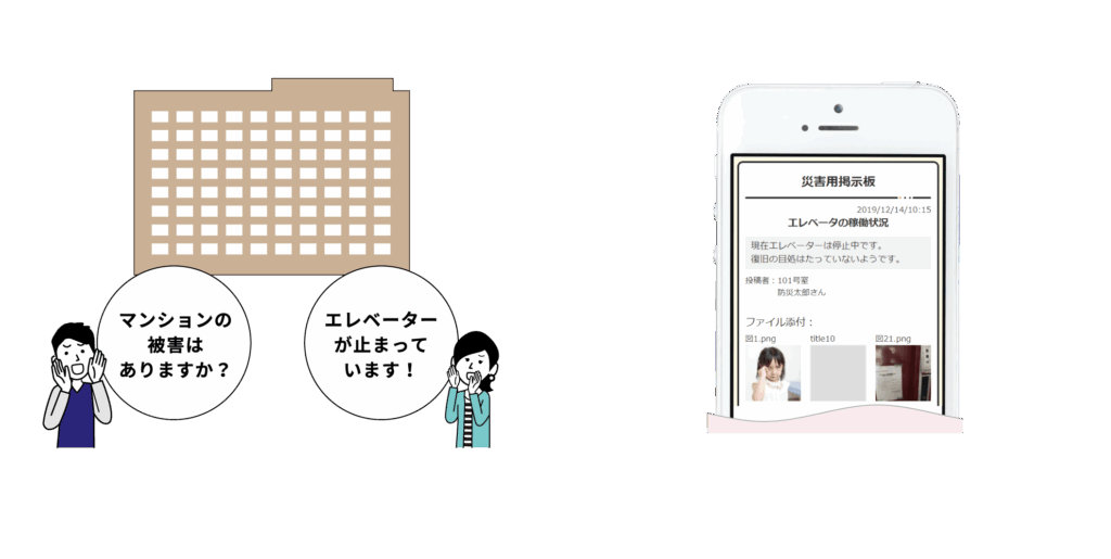 災害時に『ゆいぽた』を通じ、マンション居住者が一斉につながり情報を共有できます